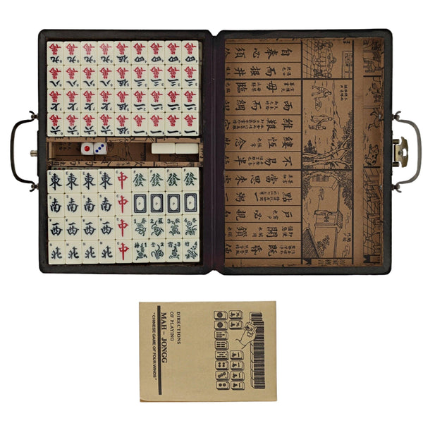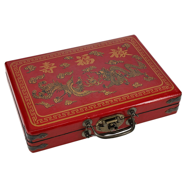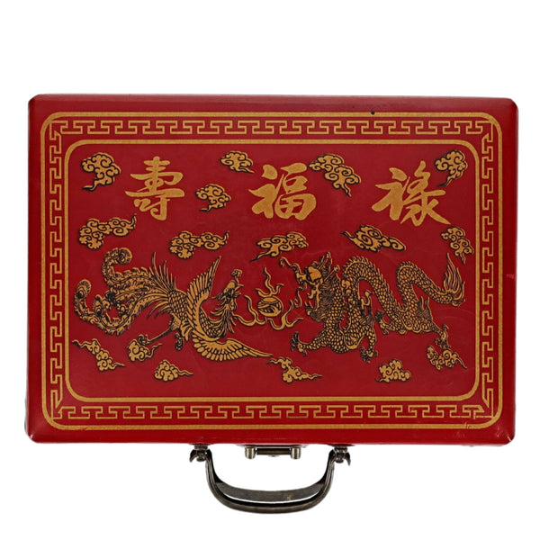 Bring Mahjong anywhere with this Traditional Chinese Mahjong Travel Set, a compact and portable Mahjong game set made for players who want authentic tile play in a smaller footprint. This set includes a full 144 Mahjong tiles, plus 2 dice and 2 blank tiles, making it a complete option for traditional Mahjong play at home or on the go. The mini tiles are made from white hard plastic and measure 24mm x 17mm x 11mm. This smaller Mahjong tile size is perfect for travel while still keeping the familiar feel of classic Chinese Mahjong tiles. Whether you play with family, friends, or Mahjong club groups, this set is an excellent choice for quick setup and easy storage. Everything packs neatly into a durable case measuring 9.75 x 7 x 2 inches. The exterior is a smooth leatherette material featuring a striking gold dragon design, giving it a traditional look that Mahjong players will instantly recognize. Inside, the printed paper lining adds an ornate, vintage-inspired design that makes the set feel special and collec